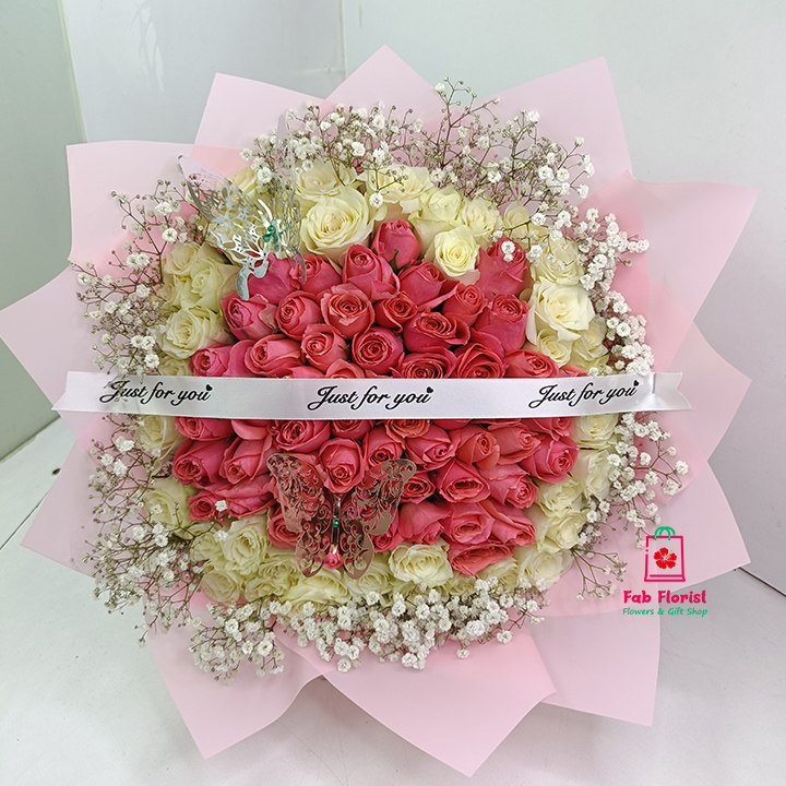 White and peach color roses perfectly with baby’s breath fillers hand-tied to make a beautiful gift for the princess she is.